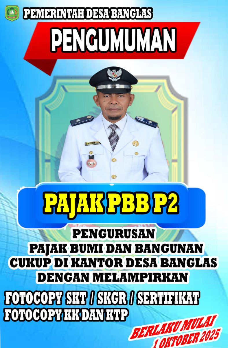 JURNALMADANI - Mulai 1 Oktober 2025, Pemerintah Desa Banglas mulai membuka layanan pengurusan Surat Pemberitahuan Pajak Terhutang (SPPT) Pajak Bumi dan Bangunan Perdesaan dan Perkotaan (PBB P2).