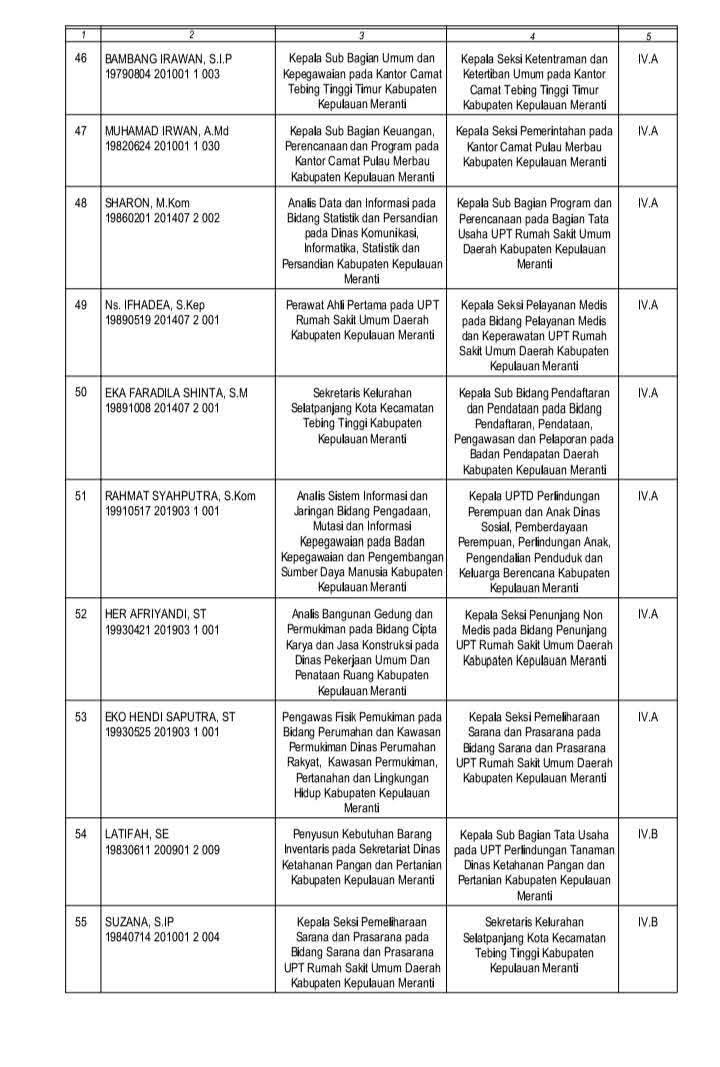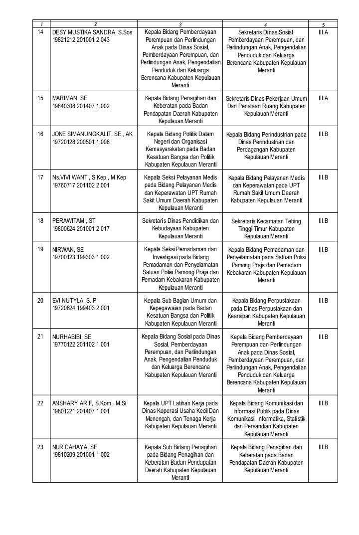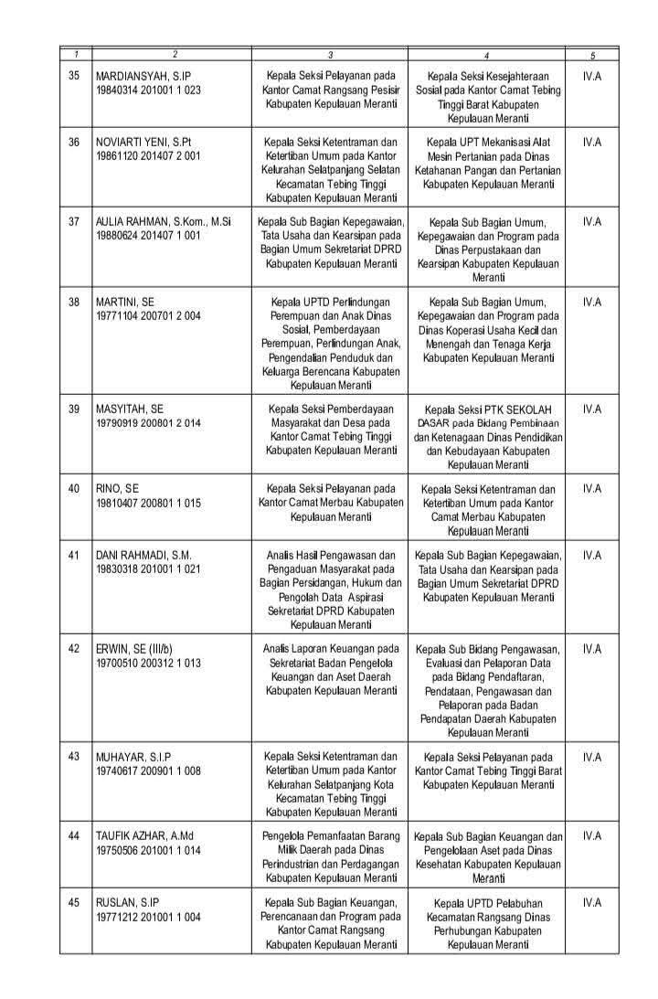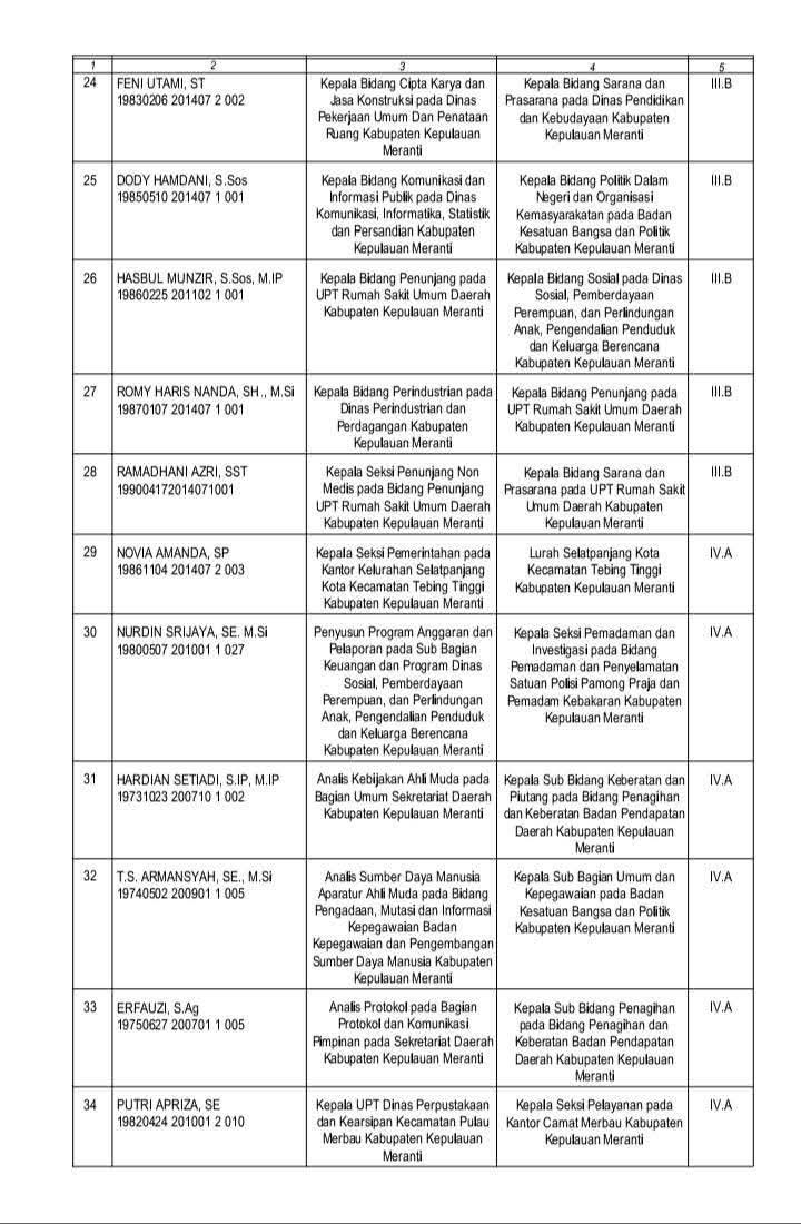 Rincian 62 pejabat yang dilantik tersebut terdiri dari 3 Pejabat Tinggi Pratama (Eselon II), 25 Pejabat Administrator (Eselon III), dan 34 Pejabat Pengawas (Eselon IV) yang mengisi berbagai posisi strategis di sejumlah perangkat daerah di lingkungan Pemkab Kepulauan Meranti.