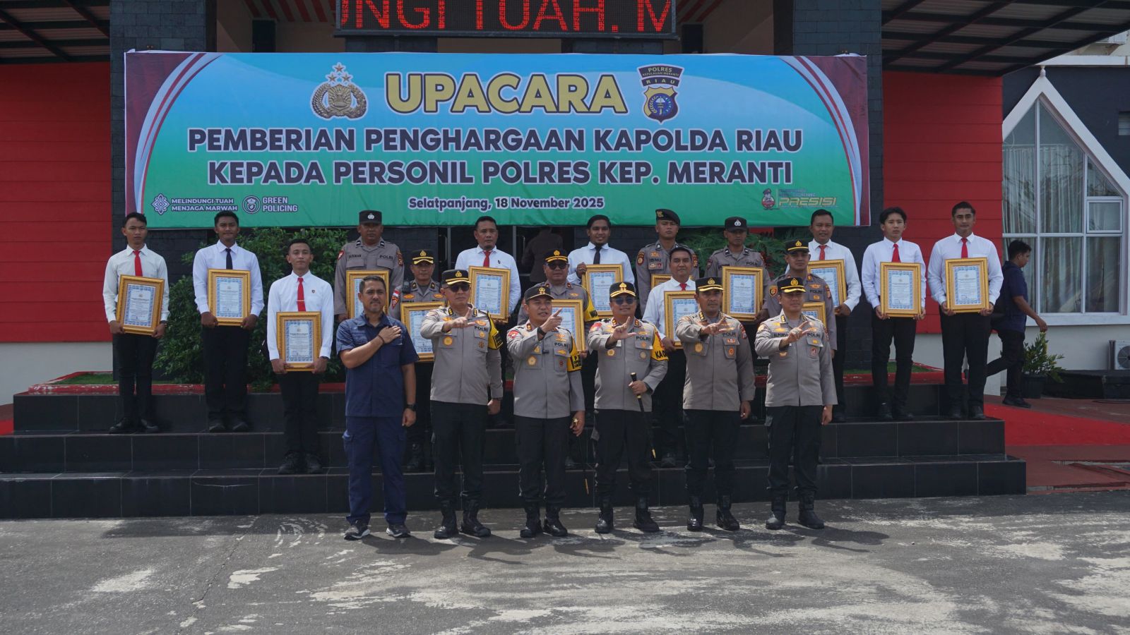 JURNALMADANI - Kapolda Riau Irjen Pol Herry Heryawan, S.I.K., M.H, M.Hum, secara langsung memberikan apresiasi penghargaan kepada personel Polres Kepulauan Meranti yang telah berhasil mengungkap tindak pidana narkotika dalam jumlah besar di Mapolres, Selasa (18/11/2025).