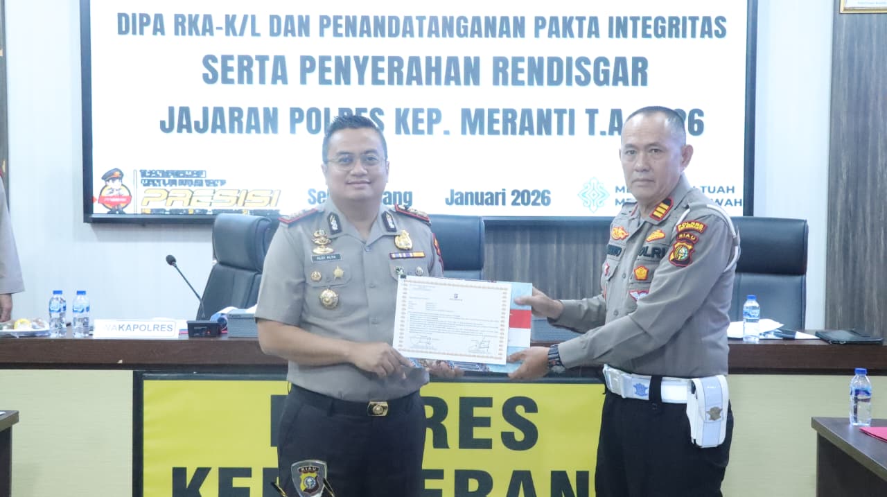 JURNALMADANI - Polres Kepulauan Meranti menggelar kegiatan Sosialisasi DIPA RKA-KL Tahun Anggaran 2026, Penandatanganan Pakta Integritas, serta Penyerahan Rencana Distribusi Anggaran (Rendisgar) kepada seluruh jajaran, Senin (19/1/2026).