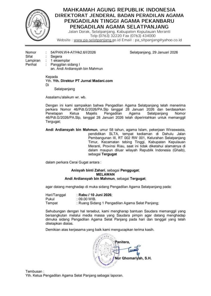 Panggilan ini disiarkan sesuai dengan surat permohonan dari Pengadilan Agama Selatpanjang Nomor 54/PAN.W4-A7/Hk2.6/I/2026, tertanggal 29 Januari 2026, yang ditandatangani oleh Panitera Pengadilan Agama Selatpanjang (Nur Qhomariyah, S.H.). (red).jpg)