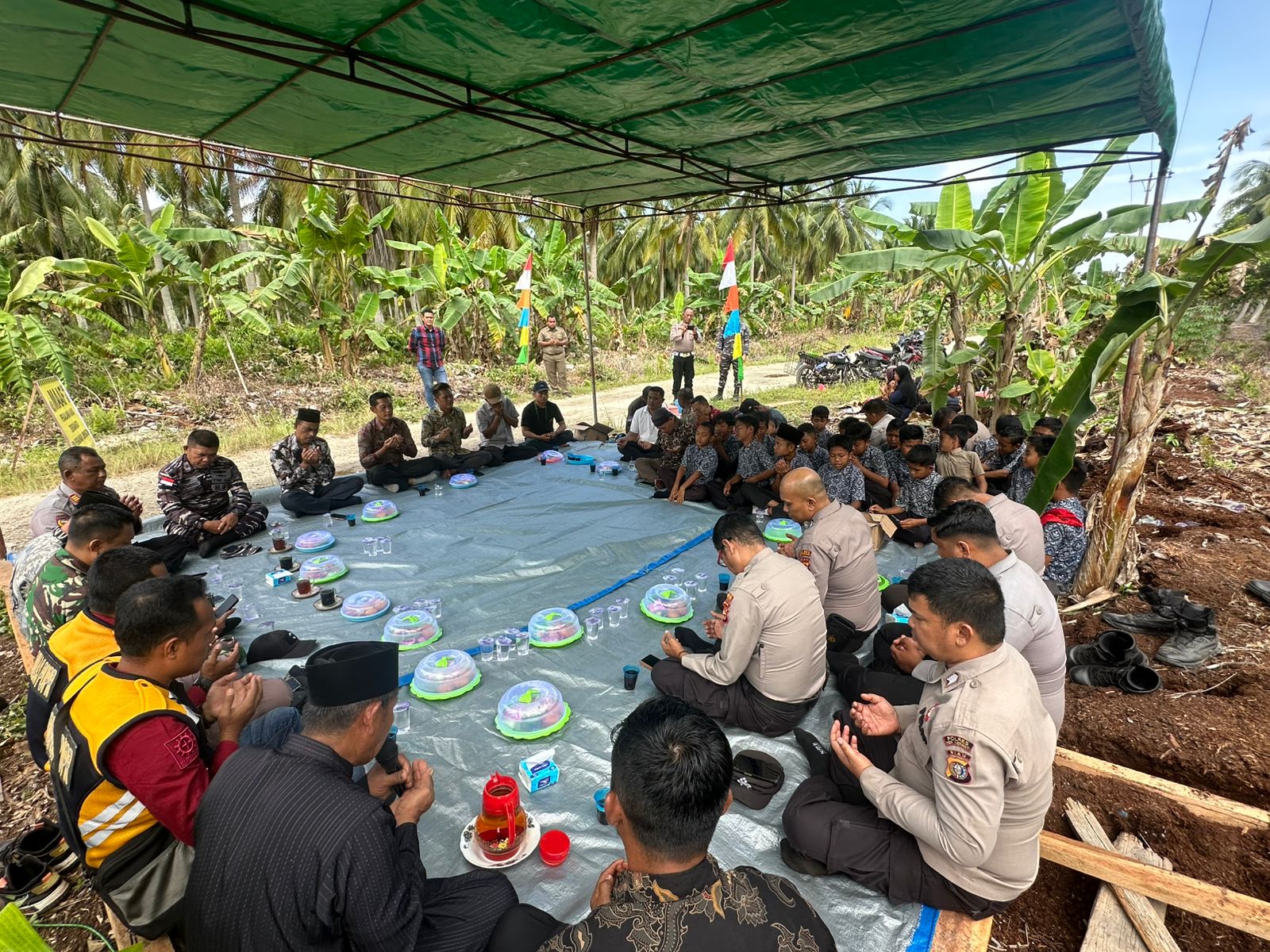 Hal yang sama juga dilaksanakan oleh Polsek Rangsang, Doa Bersama digelar untuk pembagunan Jembatan Merah Putih Presisi Polsek Rangsang di Desa Tanjung Gemuk.