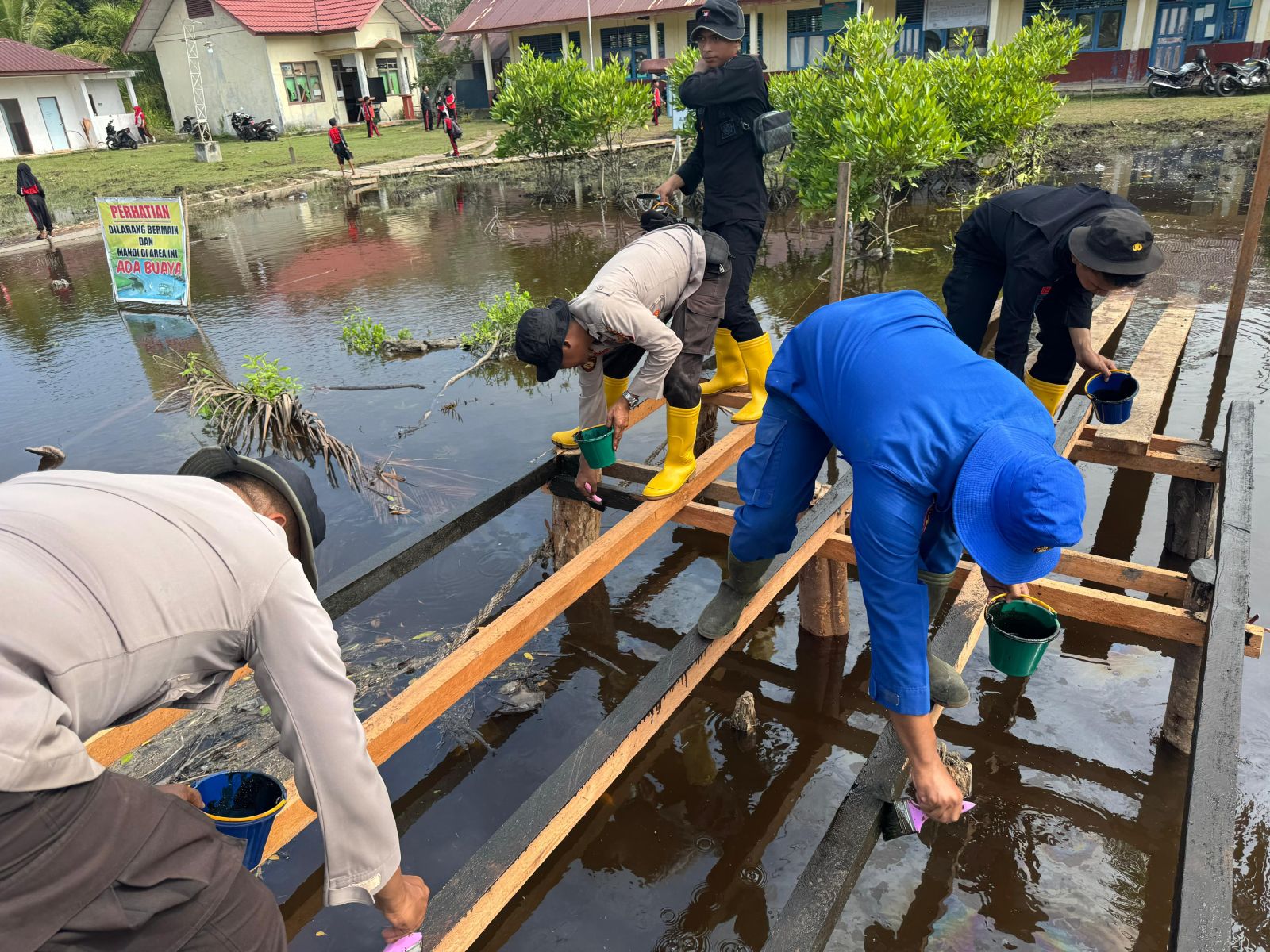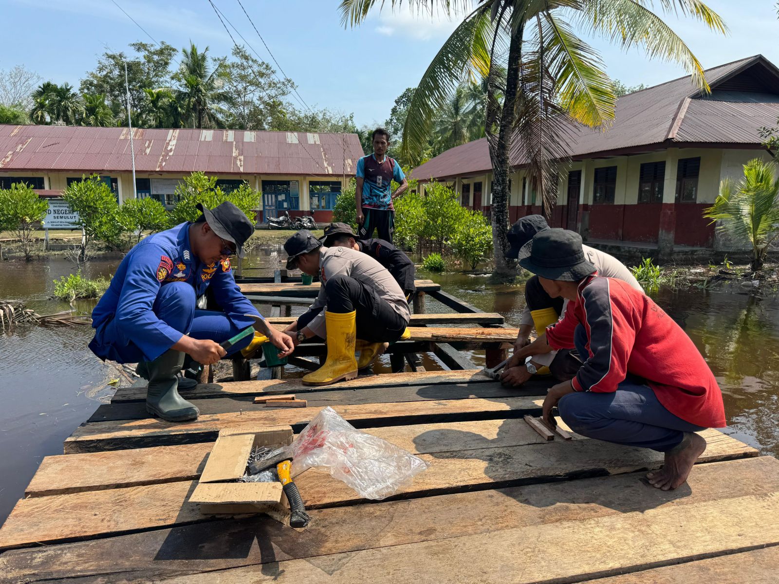 Di wilayah Polsek Tebing Tinggi, Satgas Darurat Pembangunan Jembatan melaksanakan kegiatan di SDN 018 Semulut, Dusun Semulut, Desa Banglas Barat. Sebanyak 10 personel Satgas yang terdiri dari unsur Satbrimob, Ditpolairud, dan Ditsamapta, bersinergi dengan personel Polsek Tebing Tinggi dan Polsek Rangsang Barat serta para pekerja.