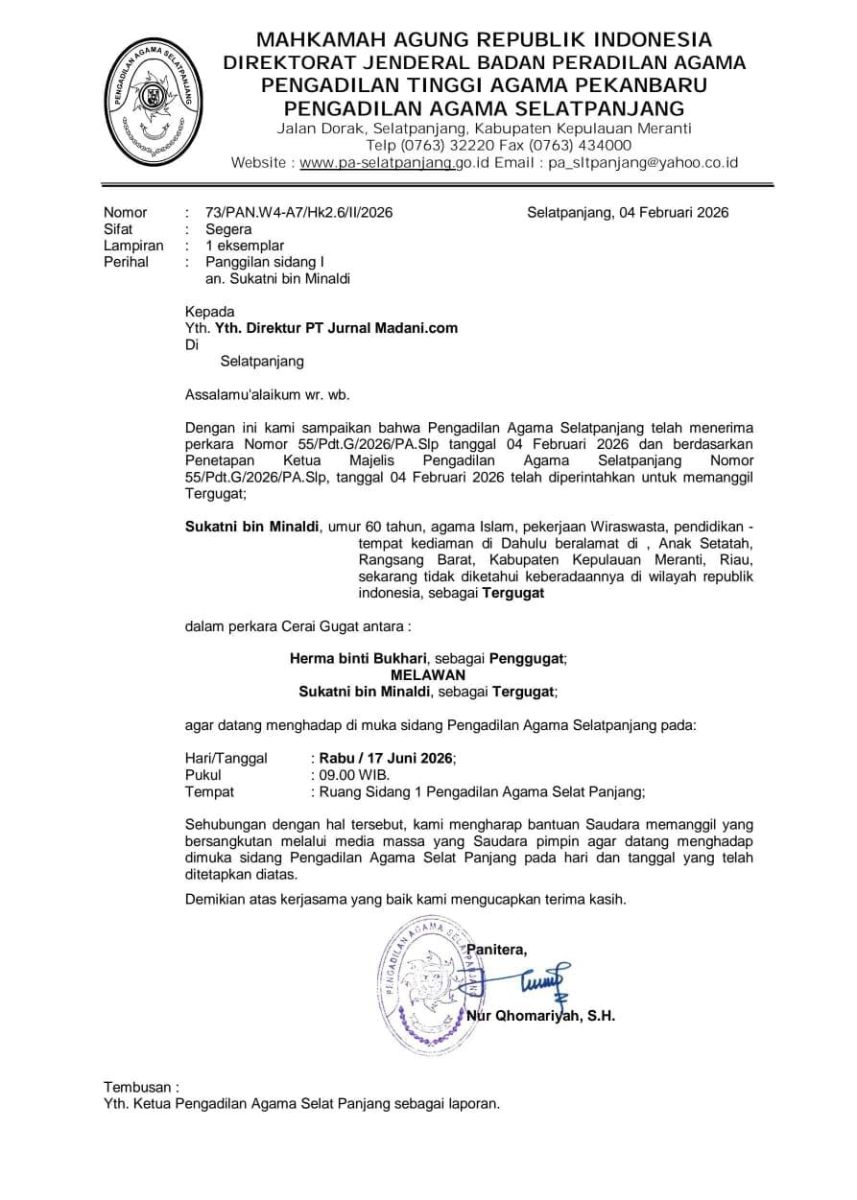 Panggilan ini disiarkan sesuai dengan surat permohonan dari Pengadilan Agama Selatpanjang Nomor 73/PAN.W4-A7/Hk2.6/II/2026, tertanggal 4 Februari 2026, yang ditandatangani oleh Panitera Pengadilan Agama Selatpanjang (Nur Qhomariyah, S.H.). (red)