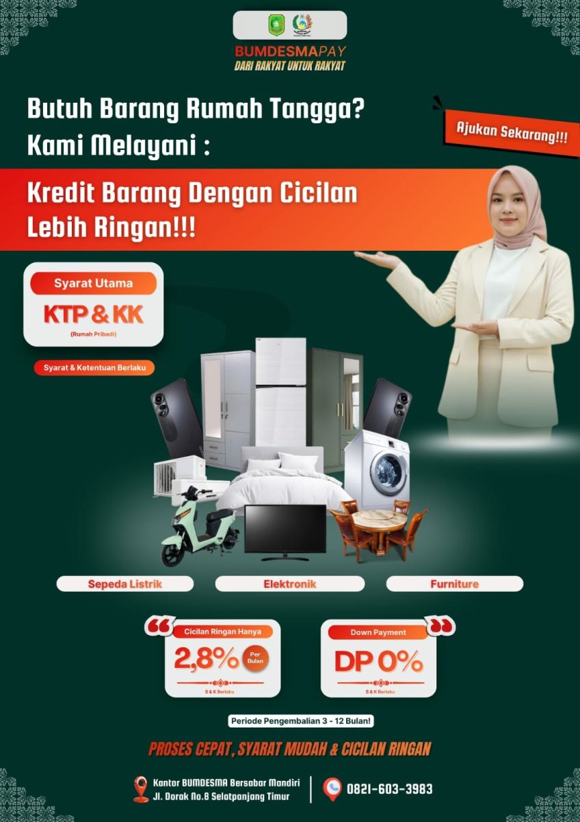 Untuk lebih jelasnya tentang layanan jasa pembiayaan kredit barang ini, tambahnya, calon debitur dapat datang langsung ke Kantor BUMDESMA Bersabar Mandiri Kecamatan Tebingtinggi di Jalan Dorak Selatpanjang, atau menghubungi customer service 08216033983. (*)