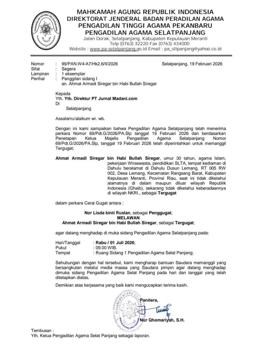 JURNALMADANI - Pengadilan Agama Selatpanjang melakukan panggilan sidang I kepada Tergugat (Ahmat Armadi Siregar bin Habi Bullah Siregar). Surat panggilan disampaikan melalui redaksi jurnalmadani.com.