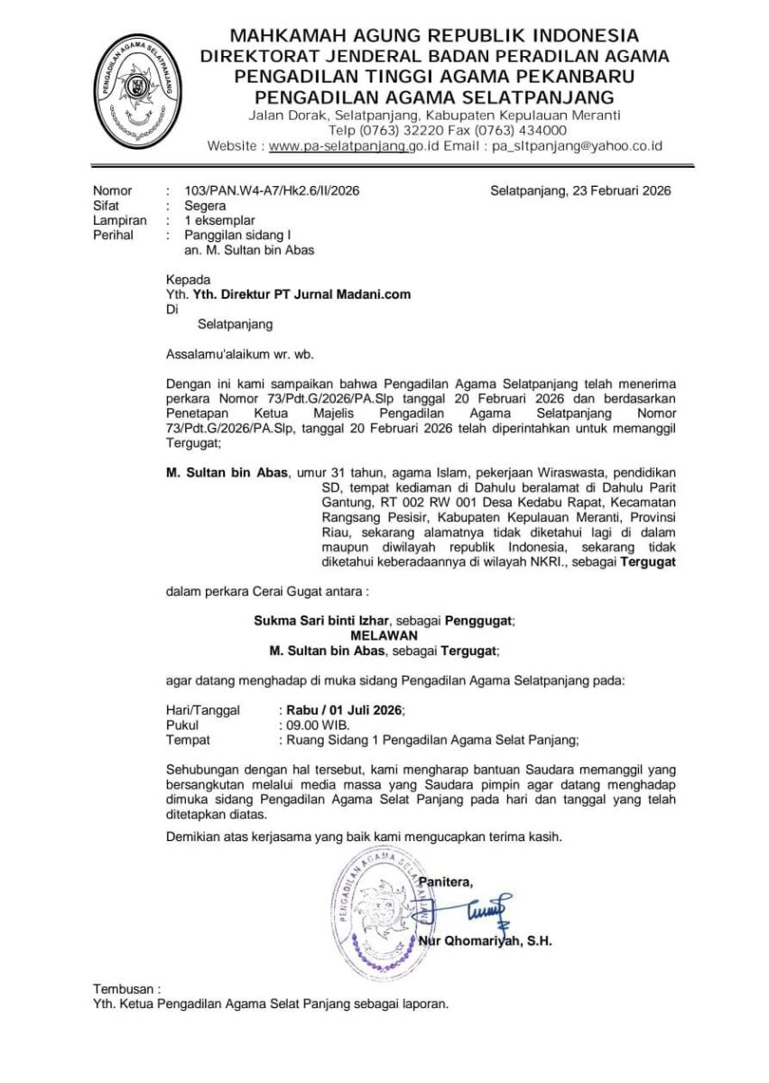 Panggilan ini disiarkan sesuai dengan surat permohonan dari Pengadilan Agama Selatpanjang Nomor 103/PAN.W4-A7/Hk2.6/II/2026, tertanggal 23 Februari 2026, yang ditandatangani oleh Panitera Pengadilan Agama Selatpanjang (Nur Qhomariyah, S.H.). (red).jpg)