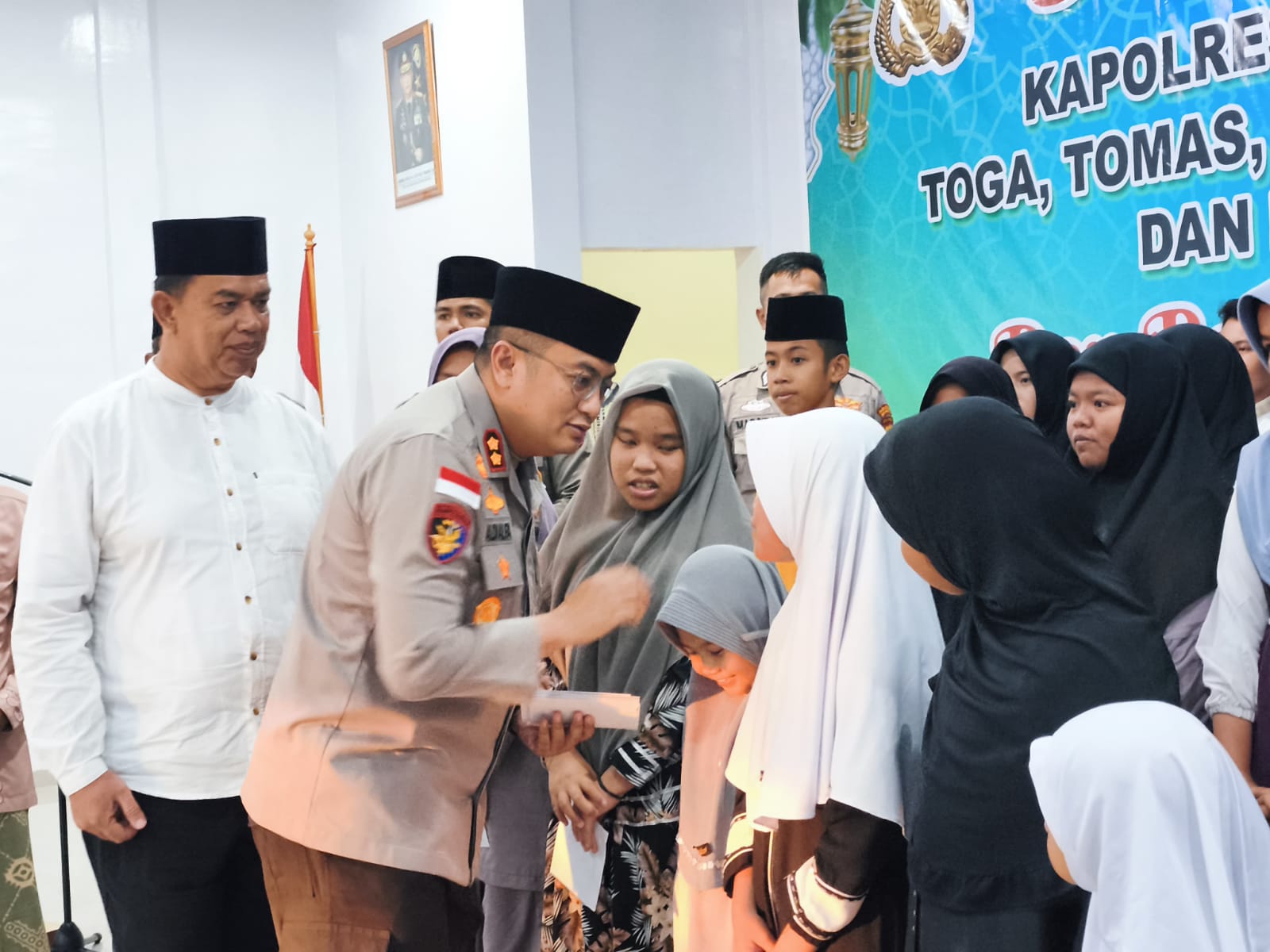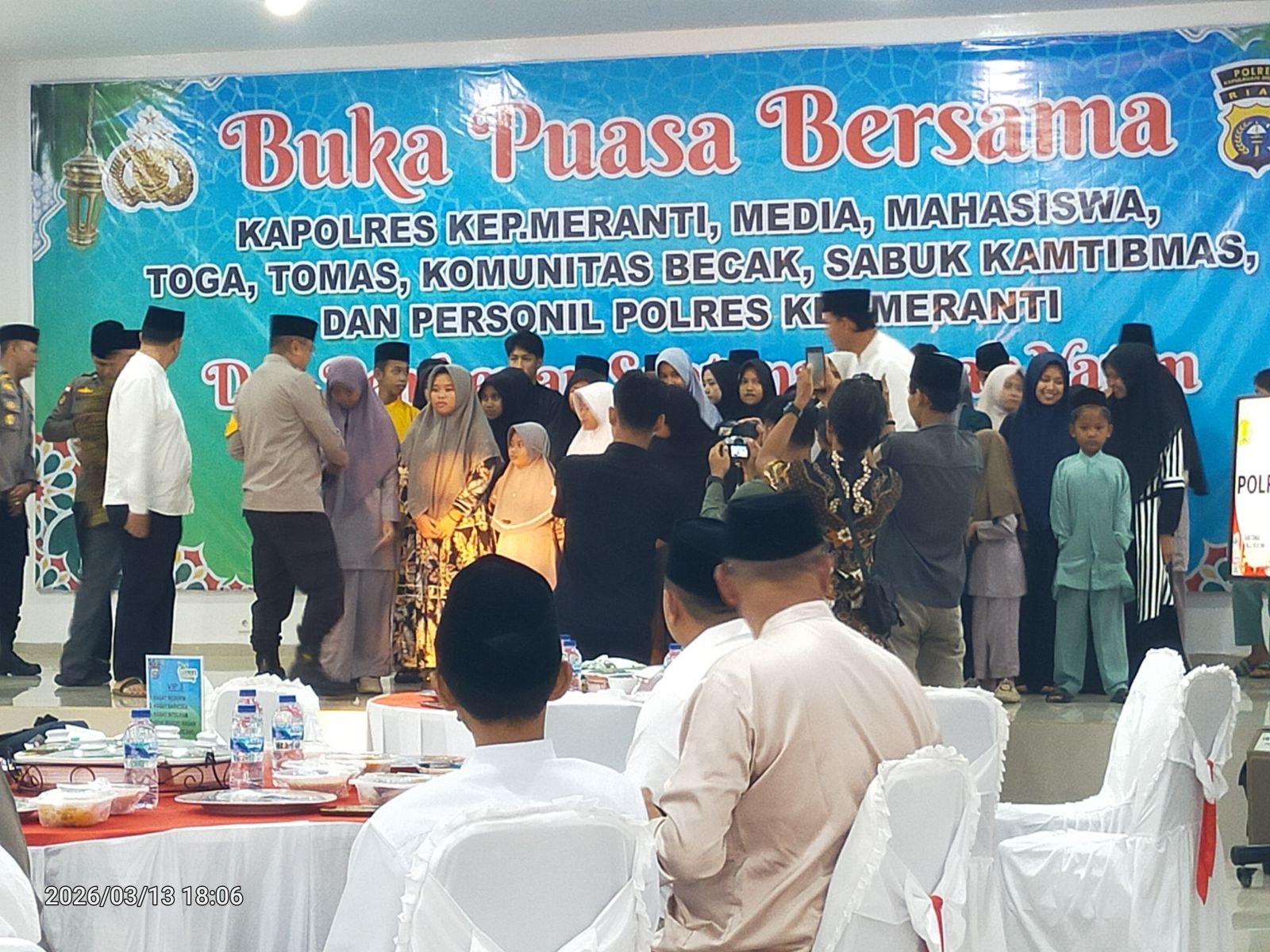 Sebelum berbuka puasa bersama, Kapolres Kepulauan Meranti bersama Ketua MUI Imam Ghozali, Ketua Umum DPH LAMR Meranti Datuk Seri Afrizal Cik, Ustaz Aljufri dan PJU Polres, melakukan penyerahan santunan kepada puluhan anak yatim yang didatangkan dari Panti Asuhan.