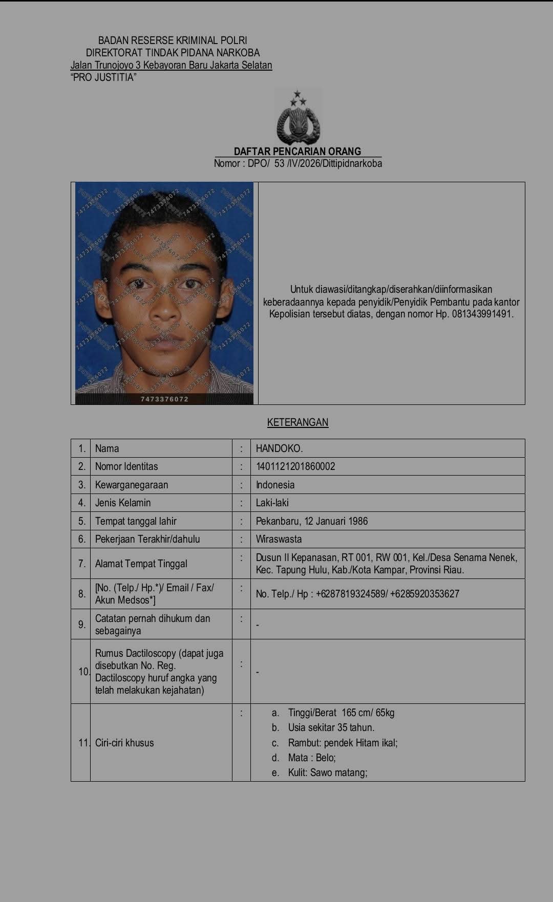 "Bagi masyarakat yang memiliki informasi terkait keberadaan Handoko, diharapkan segera menghubungi penyidik atau kantor kepolisian terdekat, atau melalui nomor telepon operasional di 0813-4399-1491," tulis keterangan dalam dokumen tersebut.